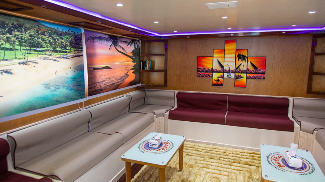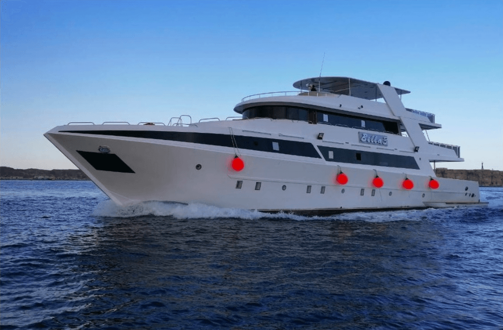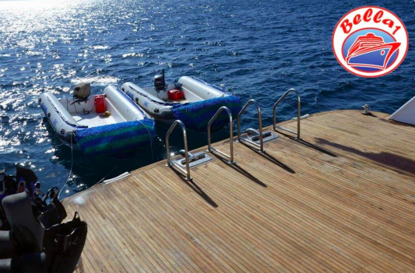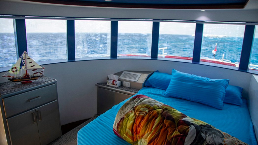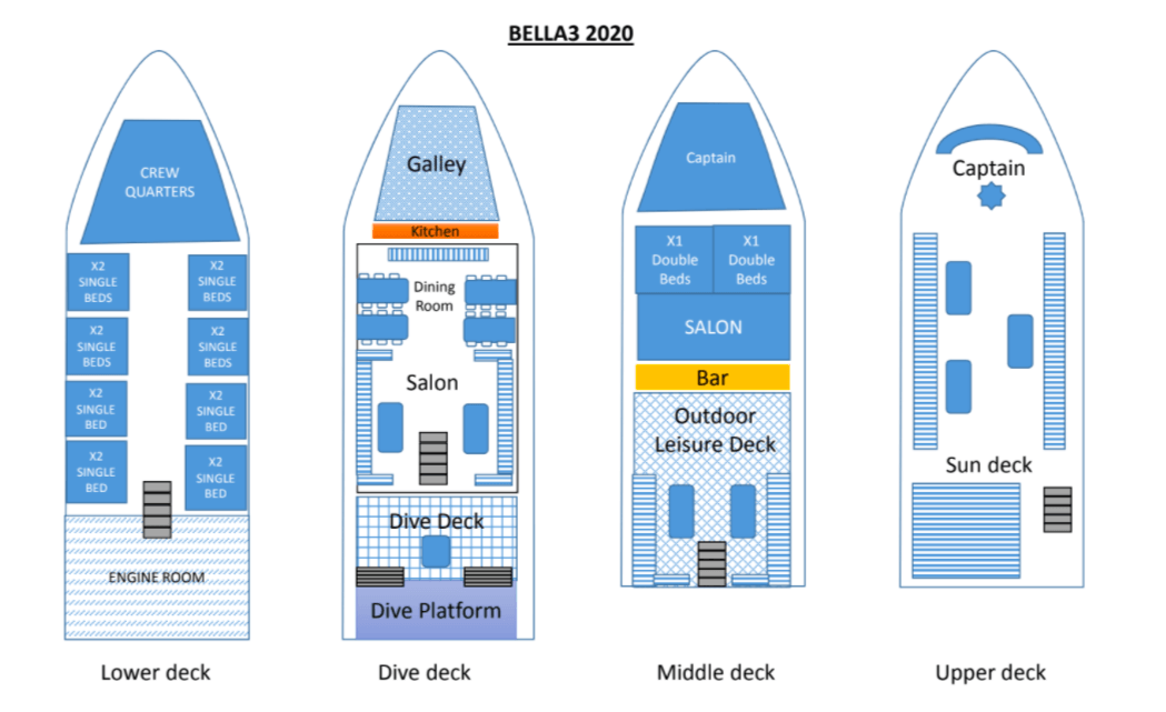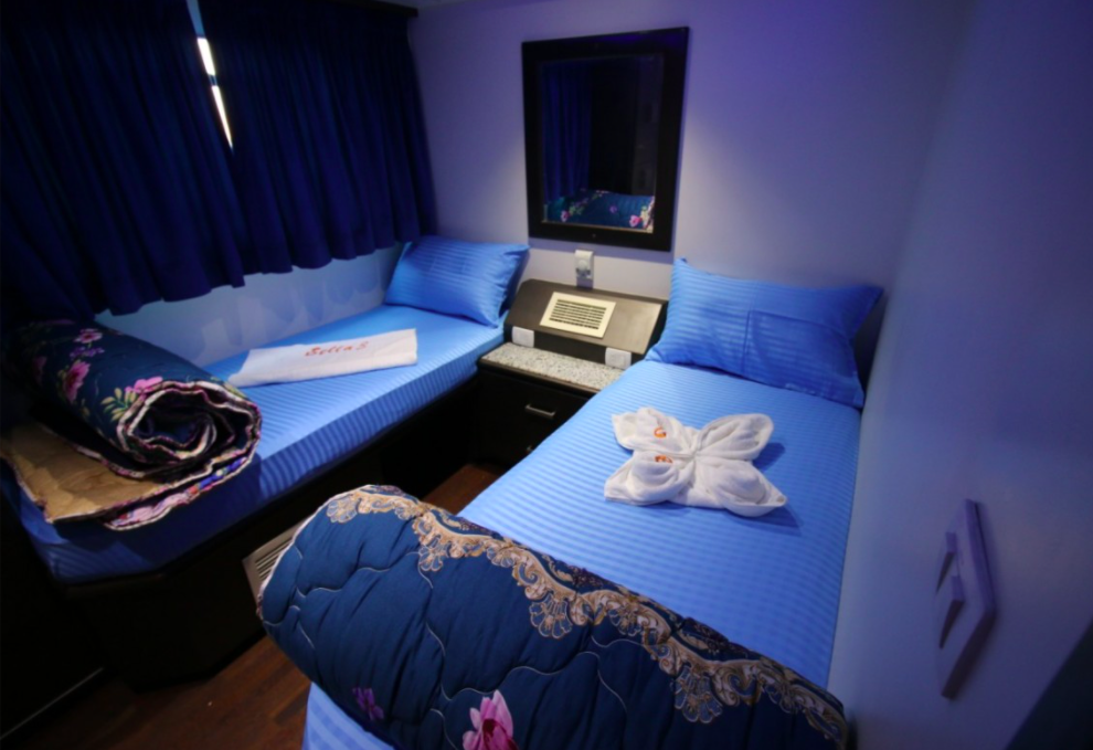 A bordo del crucero de buceo Bella 3 se pueden acomodar 20 huéspedes. Cada una de las cabinas tiene una caja fuerte, aire acondicionado de control individual y baño privado con toallas, batas de baño y secador de pelo:-