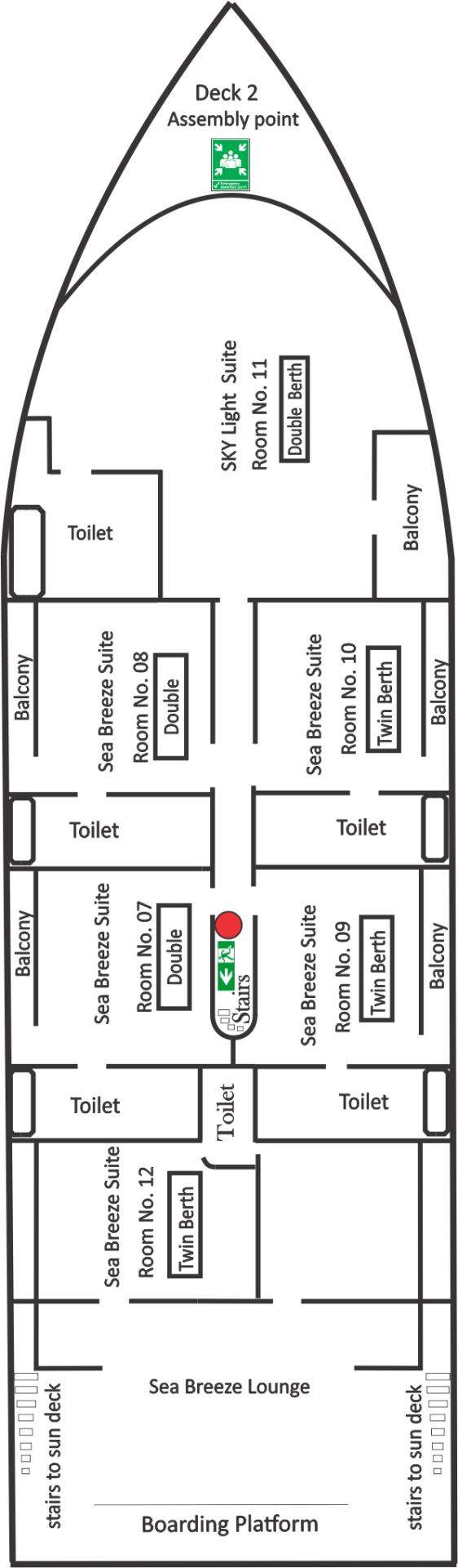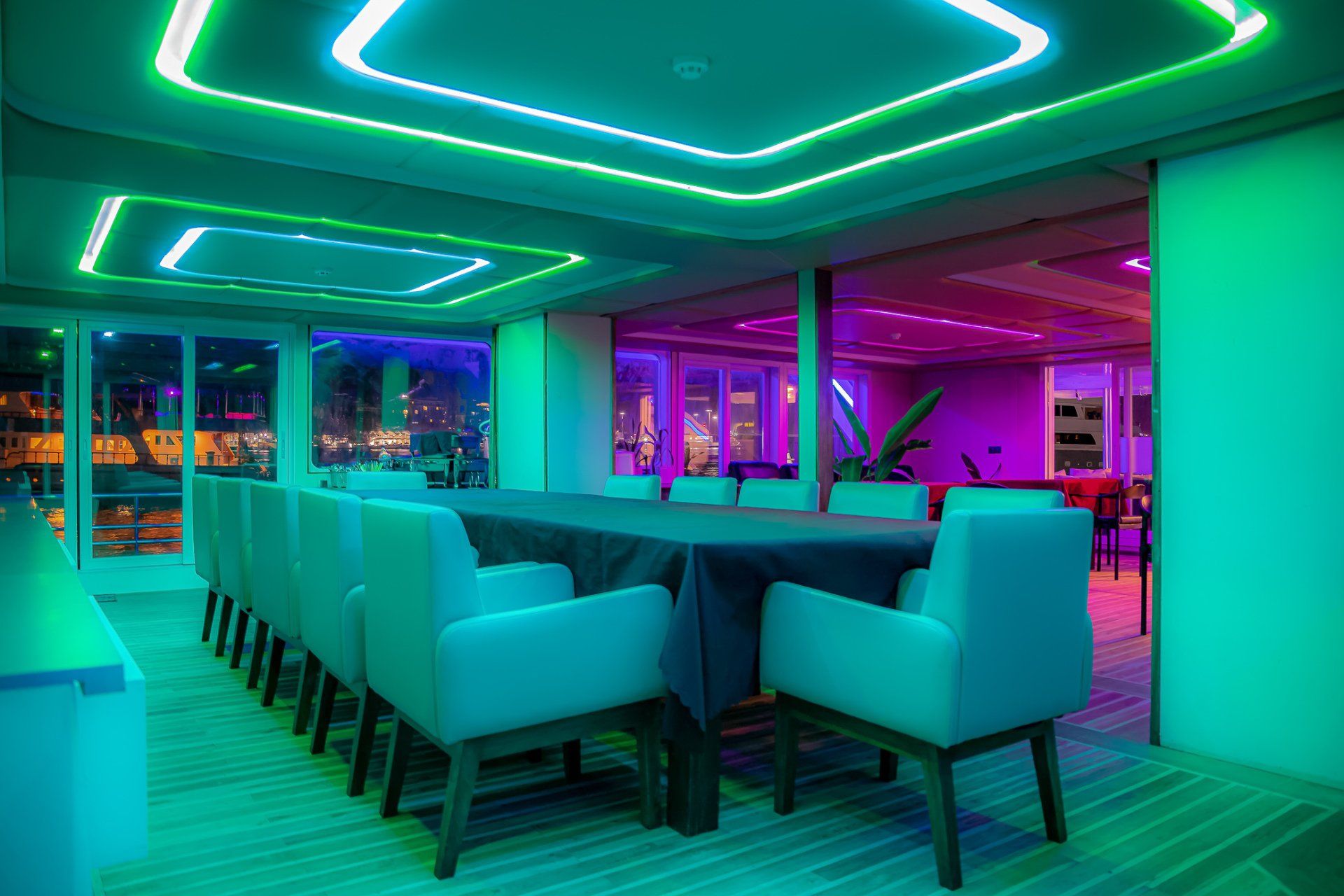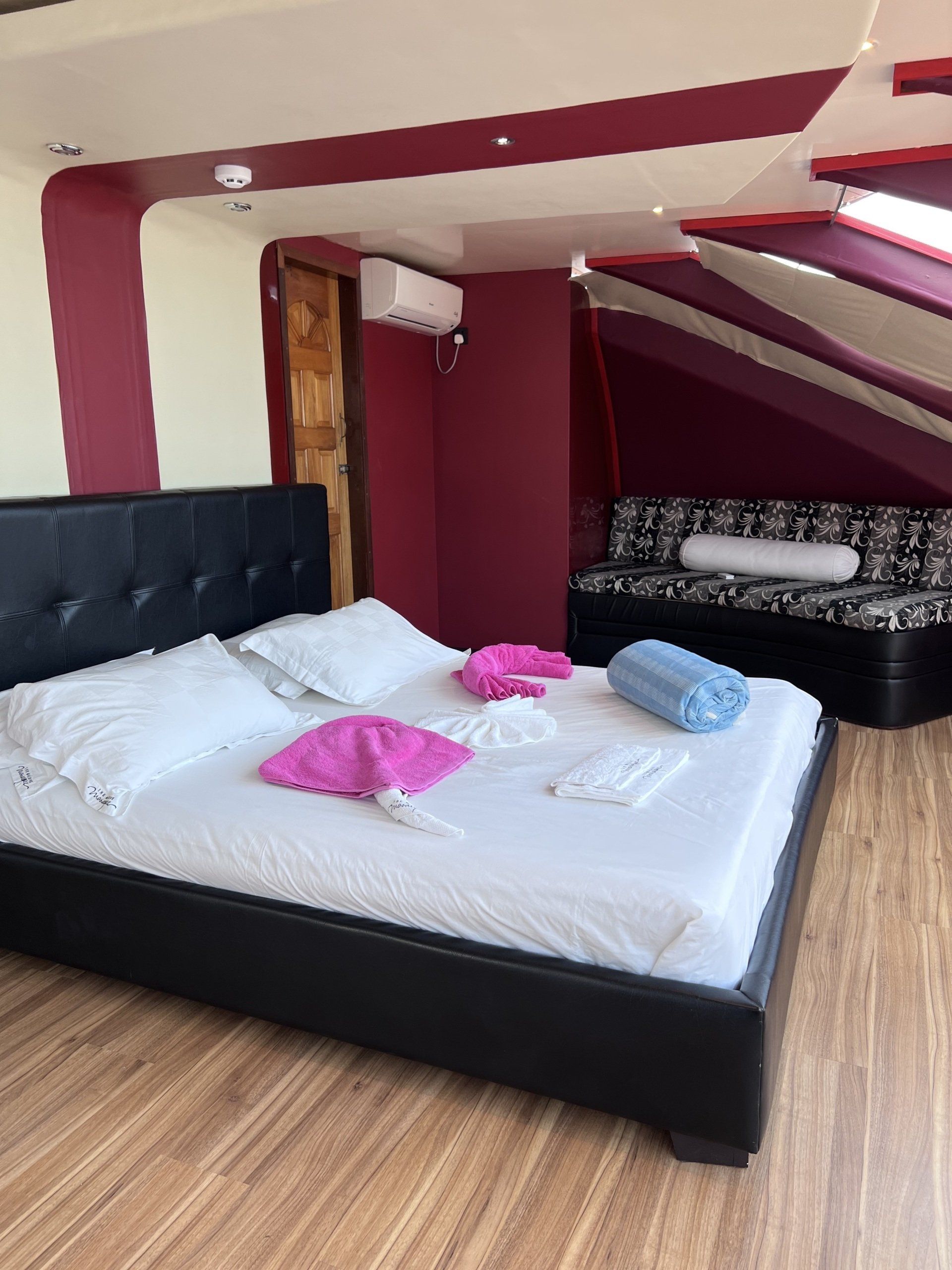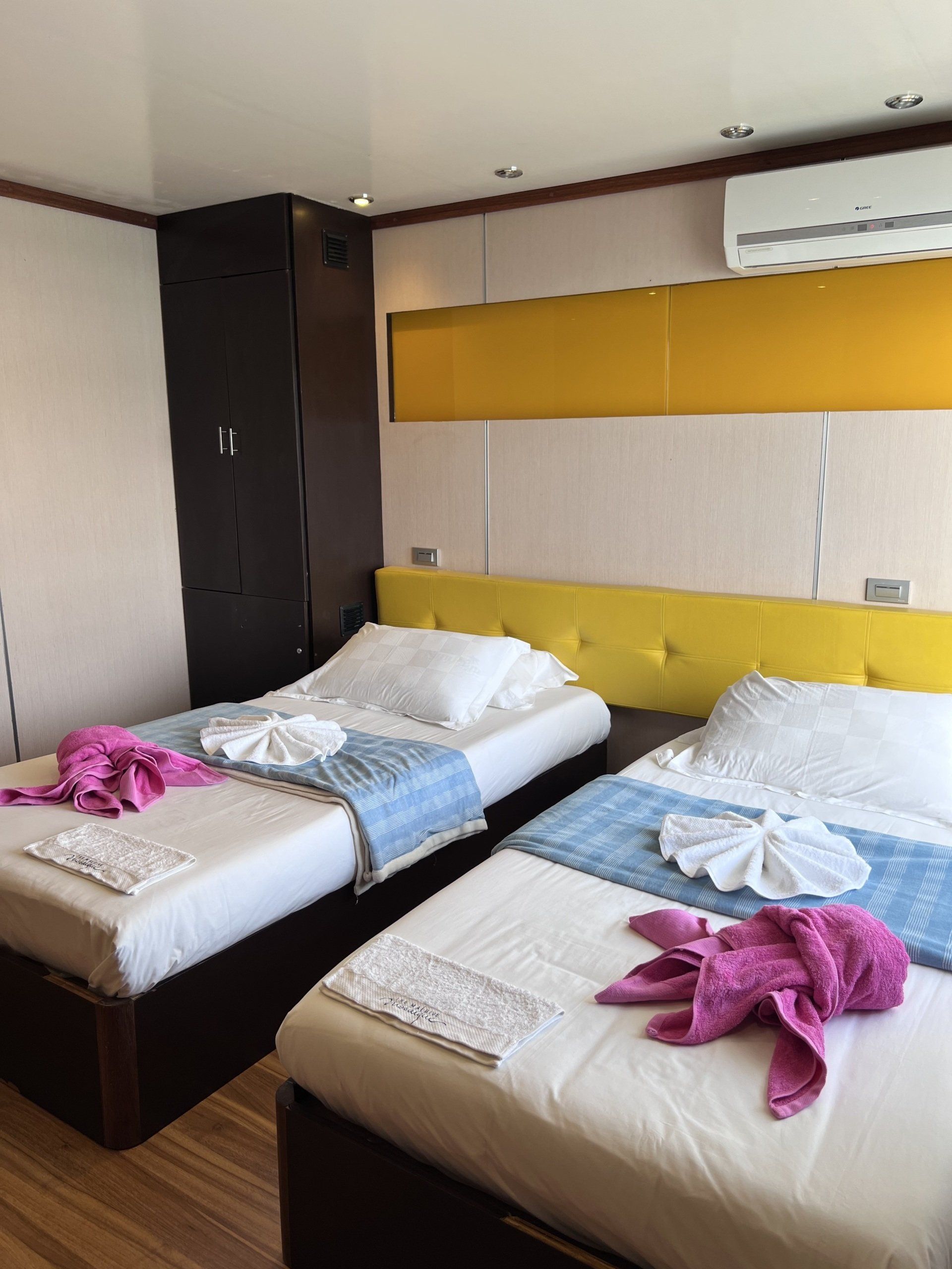 Cuenta con 4 alturas, un total de 12 cabinas, bar, restaurante, cocina, terraza y solarium con jacuzzi. Tiene una capacidad total de 24 plazas. Junto al buque principial navega el Dhoni, barco de buceo que transportará los equipos, tanques y compresores para facilitar el desarrollo de la actividad.e